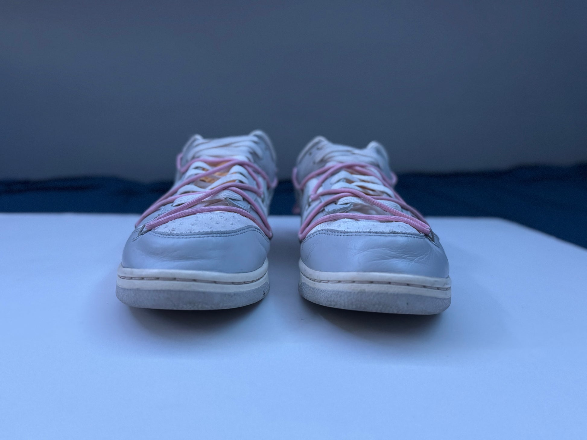 They don’t come with the original box and will come with a replacement. They have a little bit of creasing on the toe box. The toe box is also dirty with what appears to be a little bit of water stain. The shoes overall are in good condition, and they do come with the original Off-White zip tie.